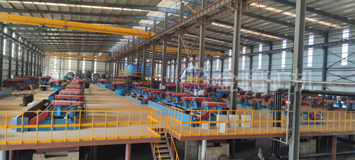 原礦經(jīng)過三段一閉路破碎系統(tǒng),采用一段閉路磨礦流程,磨礦細(xì)度為-100目占62%,經(jīng)過一次粗選一次掃選,粗精礦濃縮脫水后再磨,磨后精礦進(jìn)行三磨四選后進(jìn)行濕式篩分,正目石墨經(jīng)過一磨兩選后進(jìn)入壓濾烘干系統(tǒng),正目產(chǎn)品進(jìn)行分目包裝,篩分負(fù)目經(jīng)過一次濃縮浮選,再進(jìn)行三磨四選,進(jìn)入壓濾烘干包裝系統(tǒng),尾礦濕排至尾礦庫。