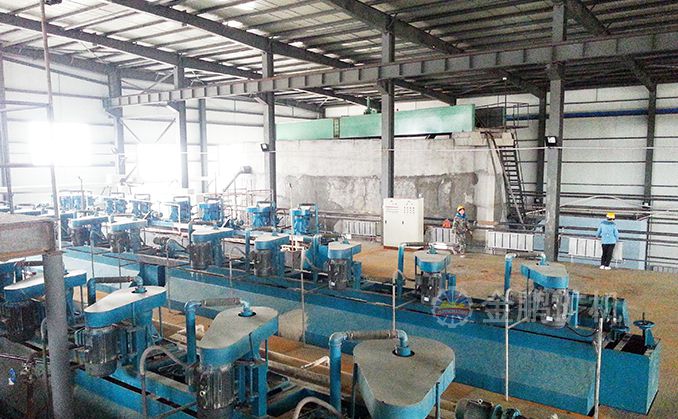 本工藝采用兩段一閉路破碎流程,合格產品進入粉礦倉緩存,礦石由擺式給礦機均勻的給到直筒節(jié)能格子型球磨機進行磨礦,格子球磨機和高堰式單螺旋分級組成一段閉路磨礦分級流程。球磨機的排礦先經過跳汰機富集大顆粒金,跳汰機底流通過兩段搖床選出30%品位的顆粒金,跳汰機的溢流進入分級機。分級溢流經過攪拌槽的調漿后進入浮選系統(tǒng),通過做礦石的可選性實驗研究我們選擇一粗三精三掃的浮選流程,從而很大程度的回收脈石中的有價金元素。浮選金精礦通過濃密機濃縮由過濾機完成脫水作業(yè),浮選尾礦由濃密機濃縮后進入壓濾機進行壓濾成濾餅做到尾礦干排。金礦重浮聯(lián)合流程也是金鵬集團用于山東黃金集團蓬萊大柳行選廠項目中的成功經驗。