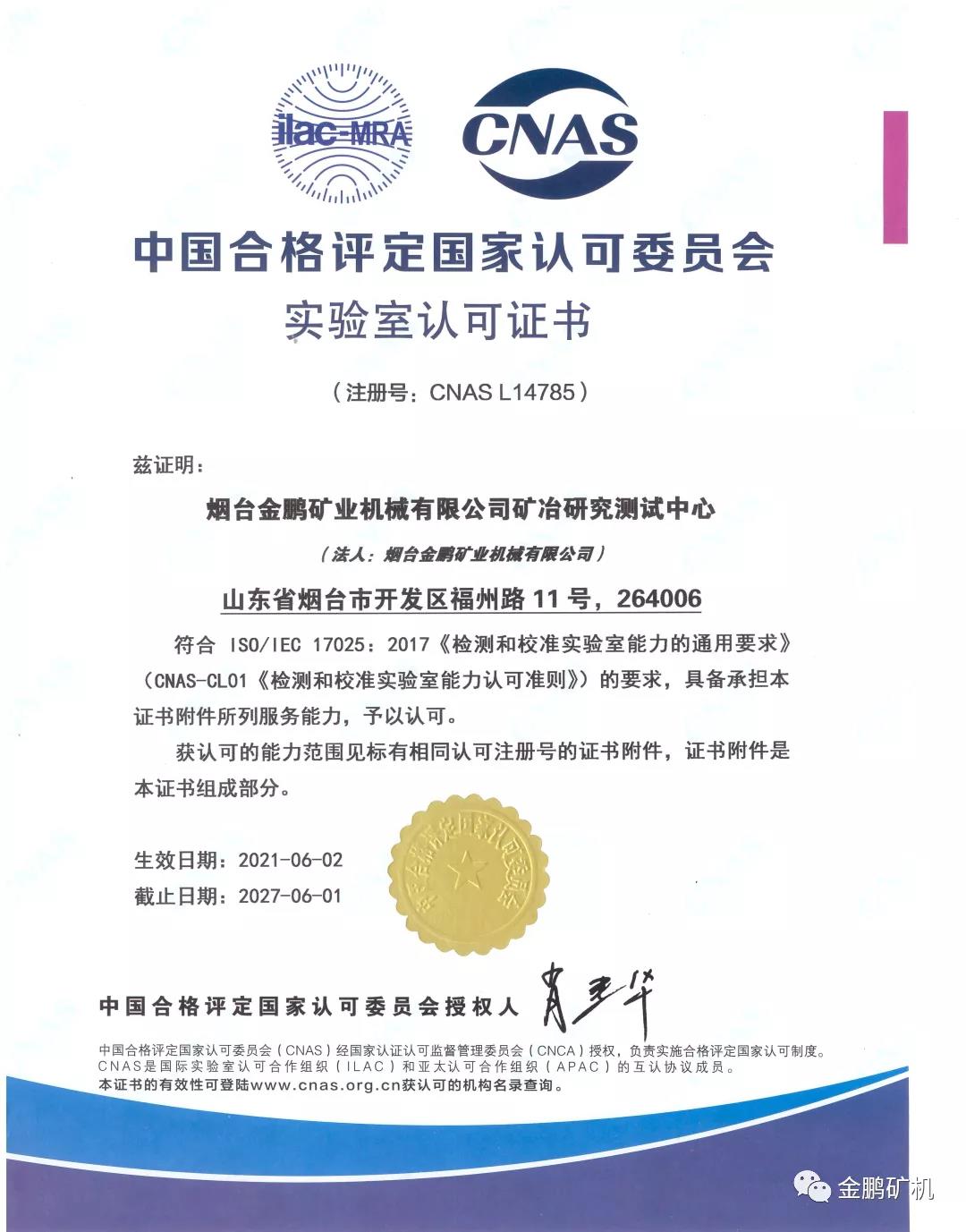 碩果源于奮斗 創(chuàng)新彰顯實(shí)力——熱烈祝賀金鵬礦機(jī)礦冶研究測試中心通過CNAS認(rèn)證