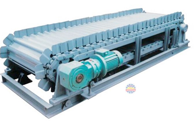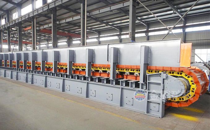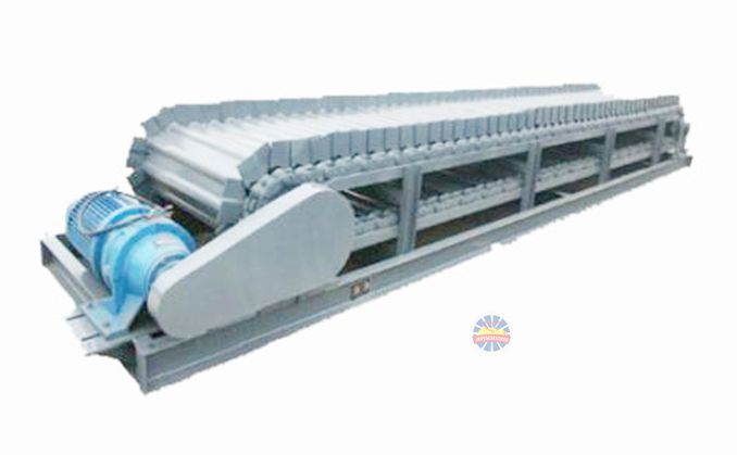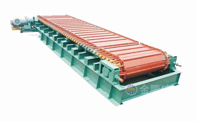 采用節(jié)距為150mm的高強(qiáng)度模鍛鏈條為牽引件,兩根鏈條繞過安裝在機(jī)體頭部的一對驅(qū)動(dòng)鏈輪和機(jī)體尾部的一對張緊輪聯(lián)成封閉形回路,在兩排鏈條的每個(gè)鏈節(jié)上裝配了相互交迭的、輕型結(jié)構(gòu)的輸送槽而成為一個(gè)連續(xù)的能夠運(yùn)載物料的輸送線路。其自重和物料的重量由安裝在機(jī)體上的多排支重輪、鏈托輪和滑道梁支承。傳動(dòng)系統(tǒng)經(jīng)交流變頻調(diào)速電動(dòng)機(jī)聯(lián)接減速機(jī),再由漲套與驅(qū)動(dòng)裝置直聯(lián)驅(qū)動(dòng)運(yùn)載機(jī)構(gòu)低速運(yùn)行。將尾部料倉卸入的物料沿輸送線路運(yùn)至機(jī)體的前方排出,實(shí)現(xiàn)向下方的工作機(jī)械連續(xù)均勻喂料的目的。