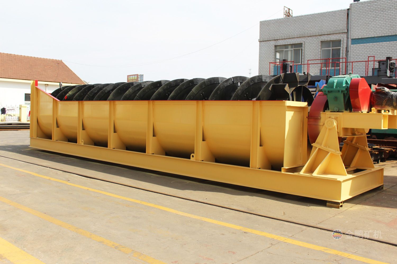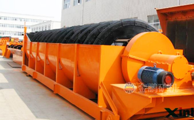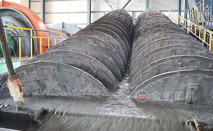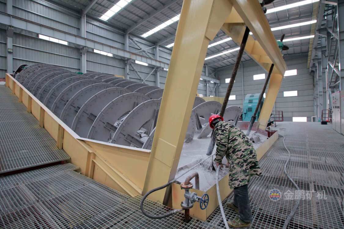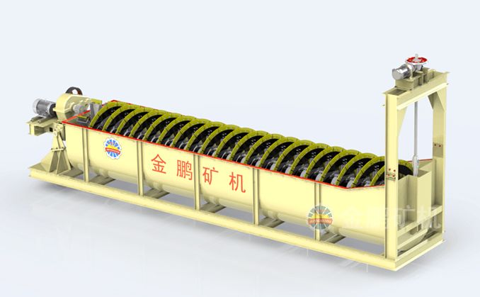 高堰式螺旋分級機采用將磨細后的礦漿從位于沉降區(qū)中部的進料口給入水槽,傾斜安裝的水槽下面是礦漿分級沉降區(qū),螺旋低速轉(zhuǎn)動,對礦漿起攪拌作用,使細顆粒懸浮到上面,流到溢流堰處溢出。粗顆粒沉到槽底,由螺旋輸送到排料口作為返砂排出。溢流堰的位置高于螺旋軸下端的軸承中心,低于溢流端螺旋上緣。